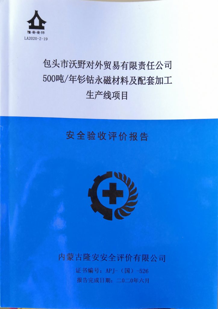 包頭市沃野對外貿(mào)易有限責任公司500噸/年釤鈷永磁材料及配套加工生產(chǎn)線項目安全驗收評價報告