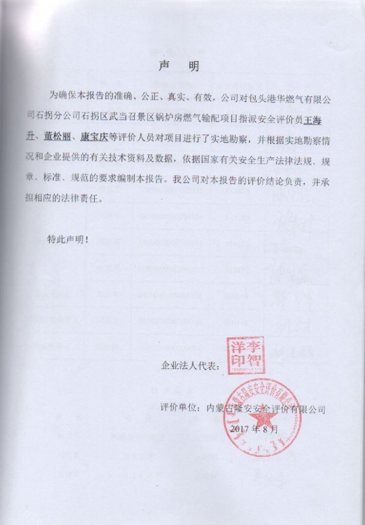 包頭港華燃氣有限公司石拐分公司石拐五當召景區鍋爐房燃氣輸配項目安全現狀評價報告–簽字表