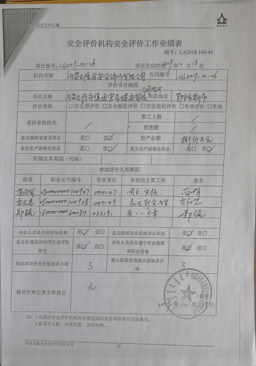 本次評價認為:內(nèi)蒙古恒東集團宏亞煤炭有限公司煤礦生產(chǎn)系統(tǒng)、輔助系統(tǒng)及其工藝和設備運行正常,符合《煤礦安全規(guī)定》和國家有關標準要求;在井田范圍內(nèi)無其他工程,在開采過程中無超層越界現(xiàn)象;安全措施機制和管理制度及各種安全措施能夠滿足安全生產(chǎn)需要,控制各種災害的措施全面有效,符合安全生產(chǎn)條件規(guī)定,具備安全生產(chǎn)條件。