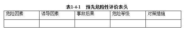 預(yù)先危險(xiǎn)性分析的結(jié)果,一般采用表格的形式。表格的格式和內(nèi)容可根據(jù)實(shí)際情況確定。本評(píng)價(jià)采用的格式如下表1-4-1所示: