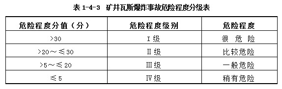 根據(jù)煤礦的實(shí)際狀況,通過(guò)專家評(píng)議對(duì)各因子進(jìn)行取值,從而計(jì)算出瓦斯爆炸的危險(xiǎn)度數(shù)值,然后按照此危險(xiǎn)度數(shù)值對(duì)瓦斯爆炸的危險(xiǎn)程度進(jìn)行分級(jí)。分級(jí)標(biāo)準(zhǔn)如表1-4-3所示。