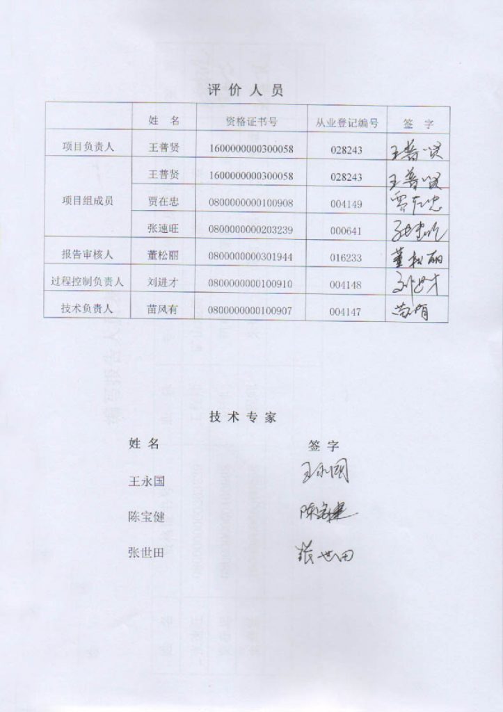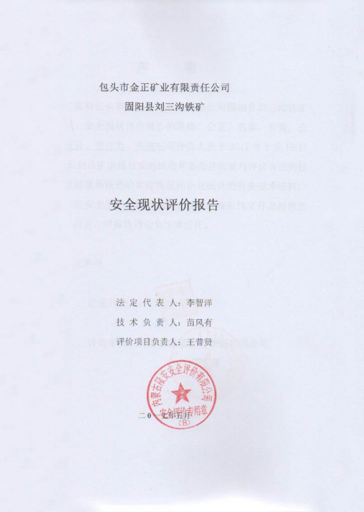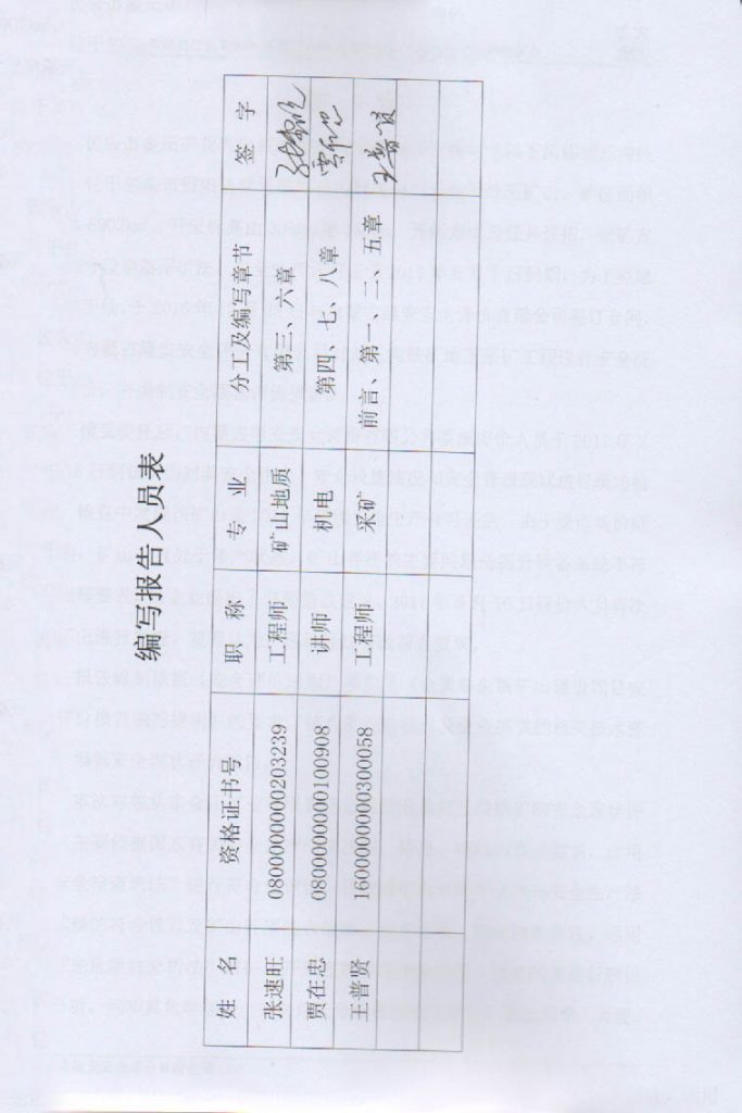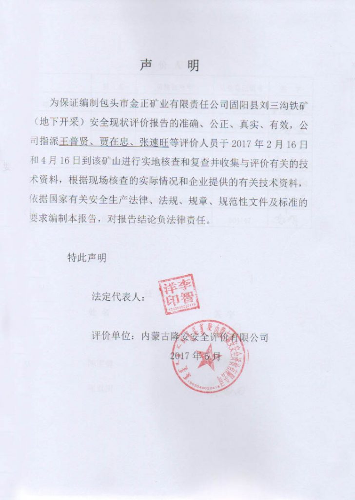 包頭市金正礦業有限責任公司固陽縣劉三溝鐵礦地下采礦工程安全現狀評價報告–簽字表