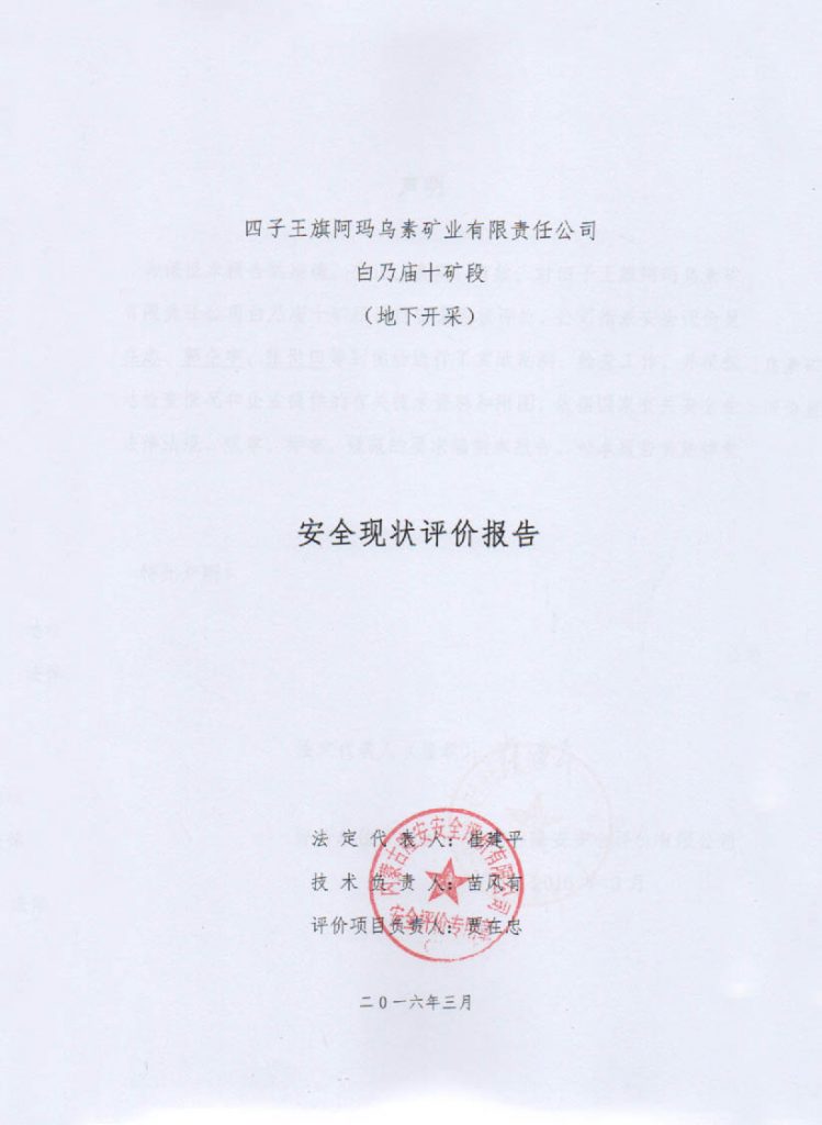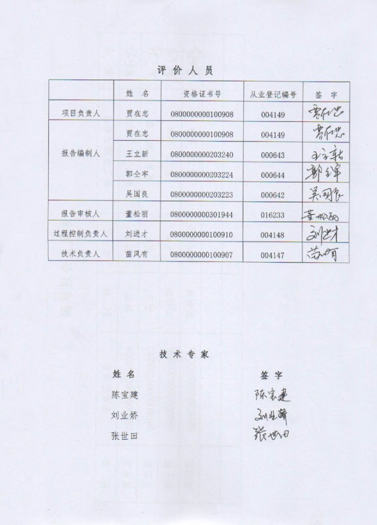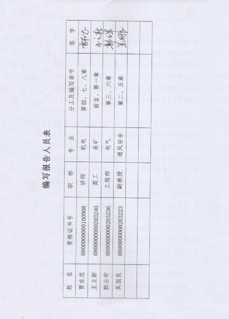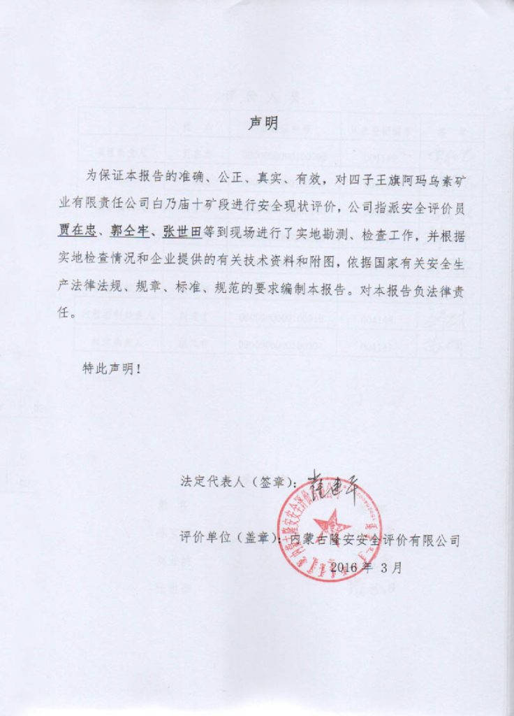 四子王旗阿瑪烏素礦業有限責任公司白乃廟十礦段安全現狀評價報告–簽字表